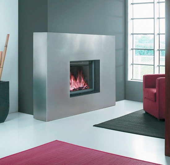 Асимметричный камин из матовой нержавеющей стали. Панорамная топка Double 75.