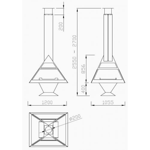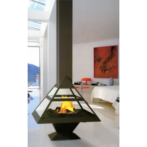 Этот уникальный центральностоящий камин в стиле High-Tech покоряет своей формой точёной пирамиды – выполненная из стекла и стали, эта модель не имеет себе равных! Обзор огня на 360 градусов позволяет наслаждаться видом чарующего пламени из любого уголка комнаты и гарантирует восхищённые взгляды окружающих.     Снабжён чугунной колосниковой решёткой, двухконтурной трубой со встроенной шиберной задвижкой, а также телескопическим элементом дымохода. Предусмотрен забор воздуха извне. Натуральная конвекция обеспечивается металлическим кожухом с отверстиями для выхода горячего воздуха. Цвет чёрный или серый (антрацит).     Опции: этаноловая или газовая горелка, дополнительная труба внешнего кожуха, розетка для потолка под наклоном, листовое покрытие для пола (из 2 частей), набор для приготовления пищи на решётке