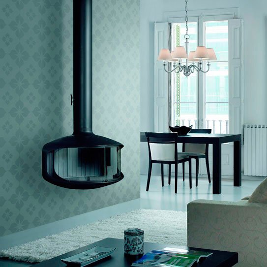 Металлический камин с полукруглыми панорамными стеклами.