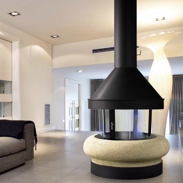Один из самых классических образцов центральных каминов TRAFORART, который совмещает в себе металл и природный камень. Составное стекло из 4-х частей. Цвет - черный.