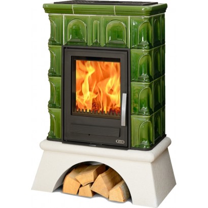 Кафельная печь Britania K - вставка комбо, белый цоколь зеленая, с теплообменником