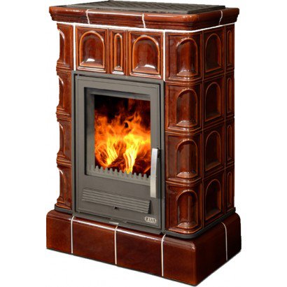 Кафельная печь Britania L - вставка чугунная, кафельный цоколь коричневая