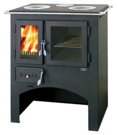Кухонная плита с духовкой - хороший выбор для пользователя, имеющего дачу или загородный дом, так как позволяет быть независимым от газовых и электрических сетей. Работающая на сухих дровах, печь имеет топку с прямым стеклокерамическим окном, духовой шкаф и варочную поверхность с тремя конфорками. В нижней части печи камина с духовкой расположена небольшая открытая дровница, в которую можно положить каминное топливо. Корпус печи выполнен из листов огнеупорной стали. Несмотря на небольшие габаритные размеры, эта кухонная плита с духовкой имеет мощность в 6 кВт и способна отапливать до 120 куб.метров жилой зоны.