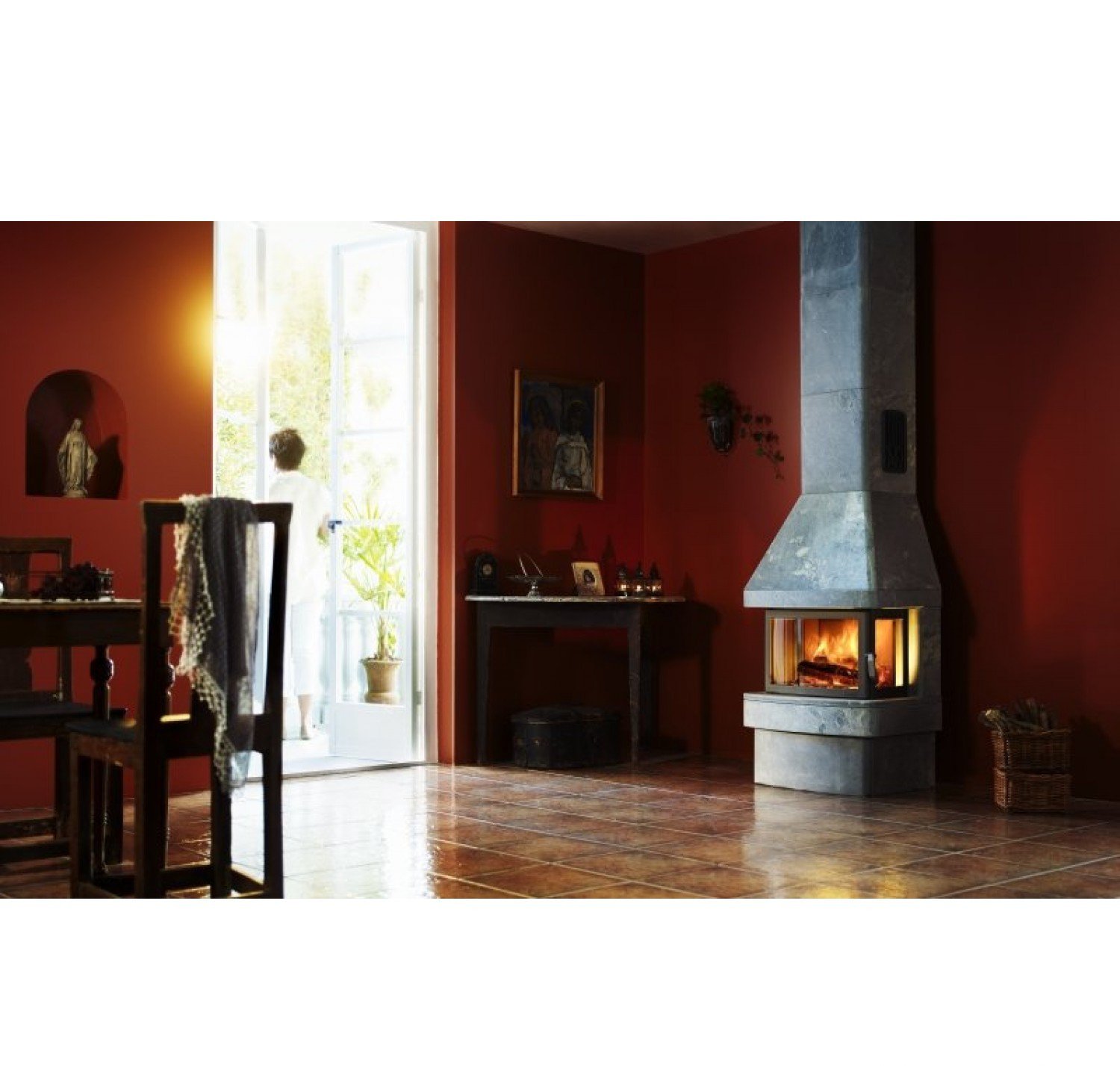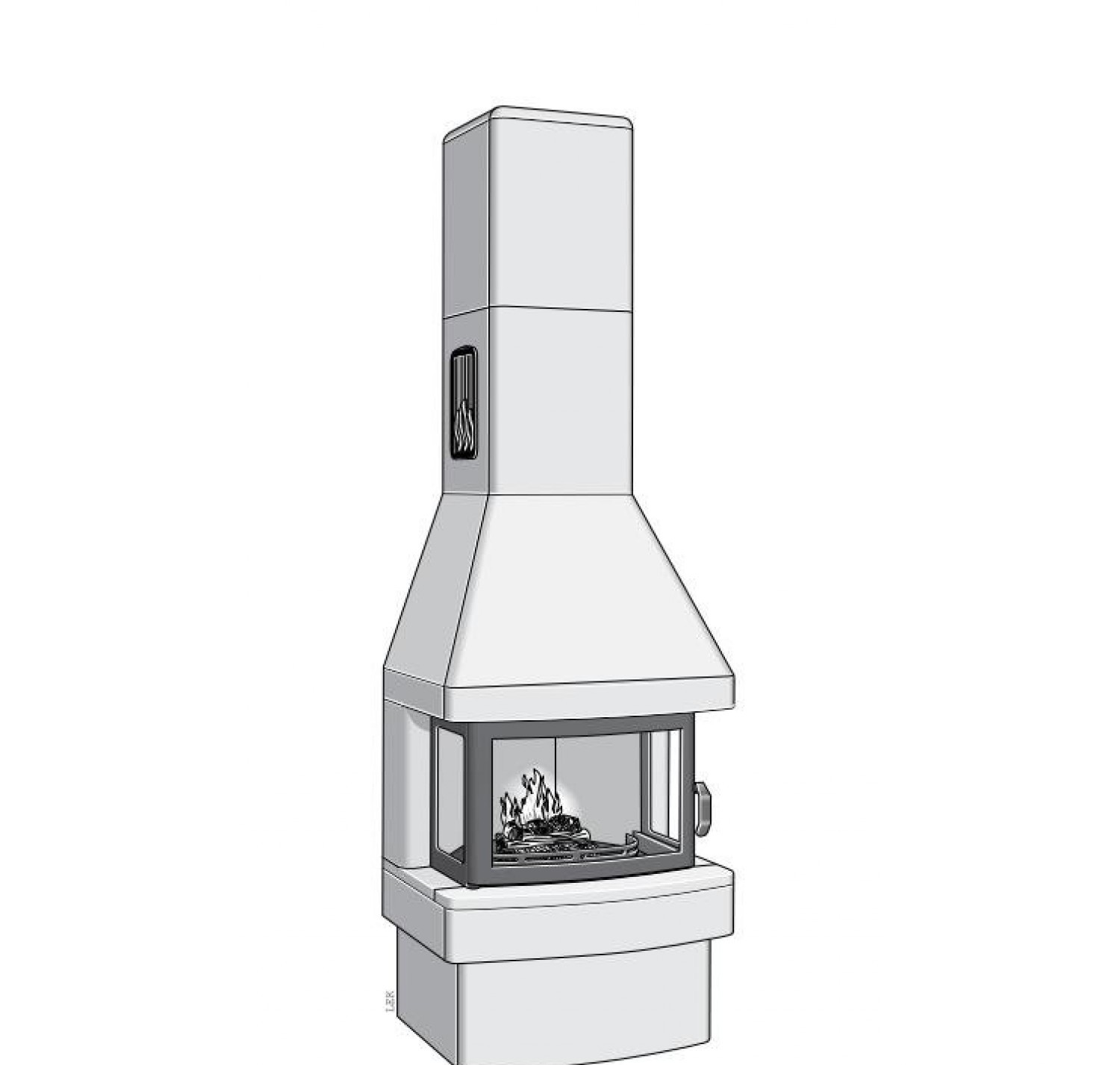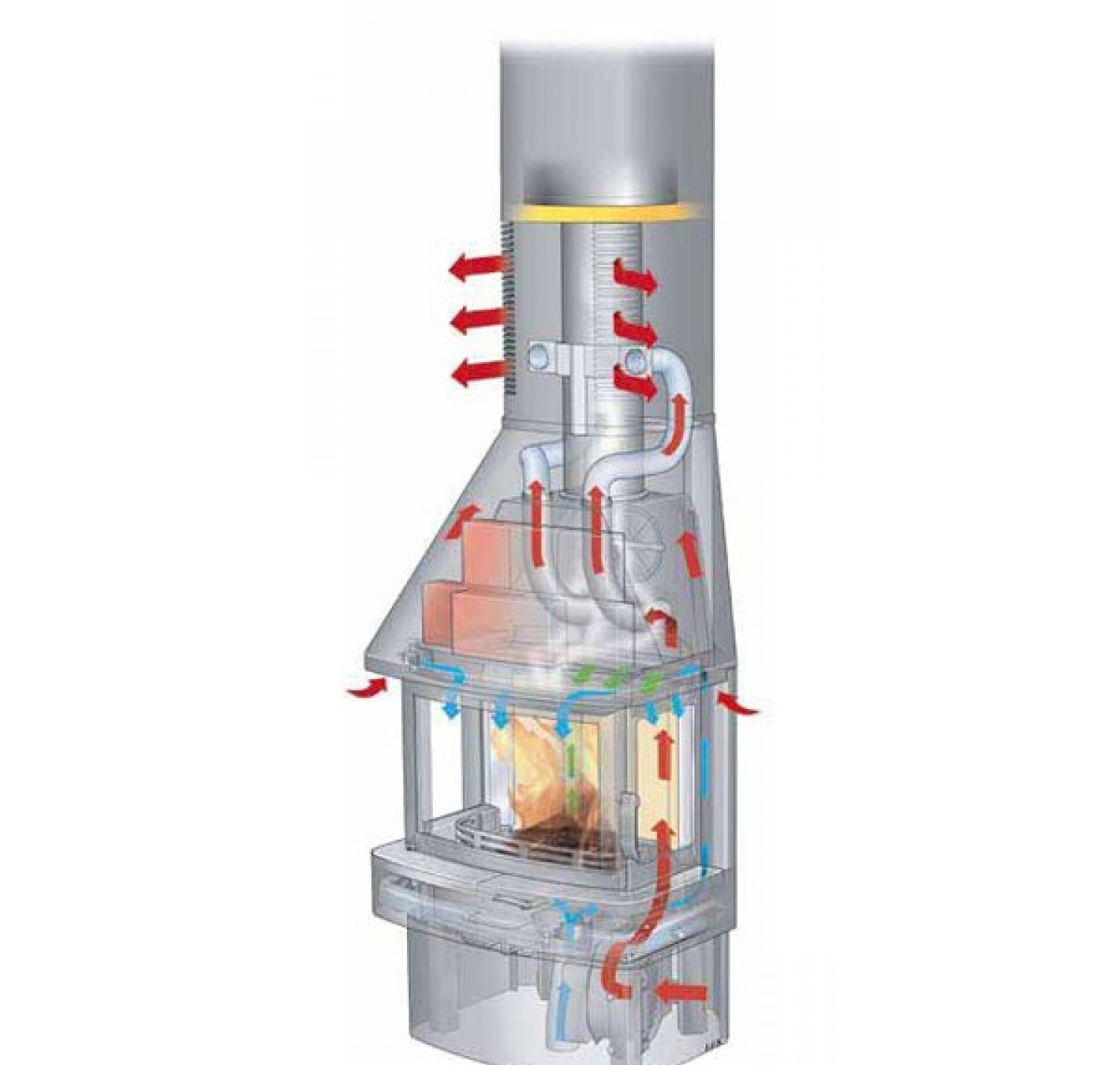 Благодаря специальной системе обогревания с конвекционными трубами внутри топки, тепло распространяется молниеносно, как только в камине будет разведен огонь. Благодаря талькомагнезиту и дополнительному нагревательному магазину под колпаком печи, печь сохраняет тепло еще в течение многих часов после того, огонь не будет гореть. Удачное сочетание характерных качеств камина и талькомагнезита. Передняя часть камина легко открывается и закрывается. Вытяжной короб для золы с крышкой облегчает чистку.