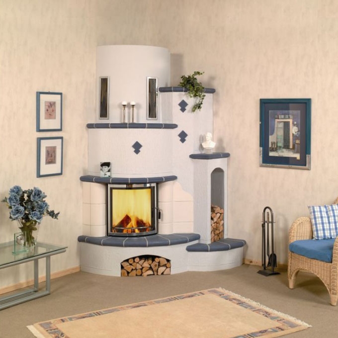 Угловой камин. Изразцы белого цвета. Столешница и каминные полки из изразцов цвета jeans blau. Боковой дровник.