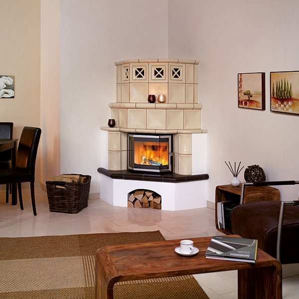 Декоративный угловой камин - отличный выбор для загородного дома или городской квартиры. Облицовка из рельефных изразцов ручной работы придают камину неповторимость и индивидуальность. Топка с призматической стеклянной дверцей. Вместительная дровница.