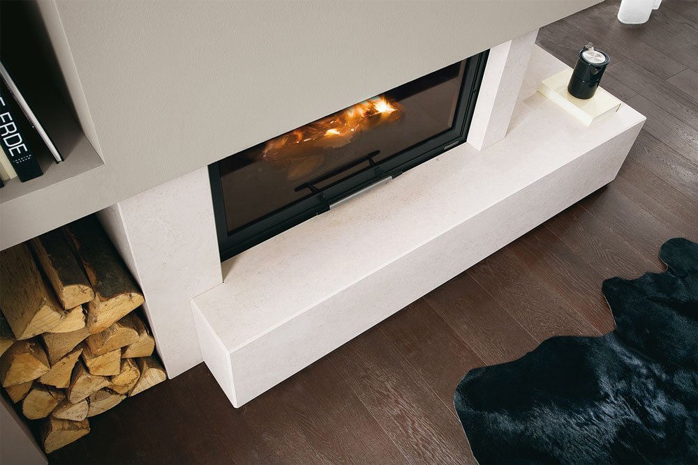 Отделка, выполненная из камня Bianco Mediterraneo. Угловой камин, правый.