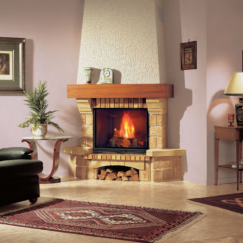 Угловой камин. Золотистый итальянский камень, балка - экзотическая древесина.