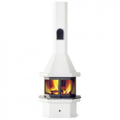 Угловая печь-камин с задним вариантом подключения и дверцами с призматическим стеклом.