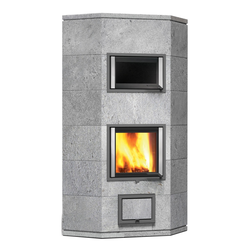 Угловой печь-камин с задним нижним подключением 2 теплового класса, для больших помещений.
