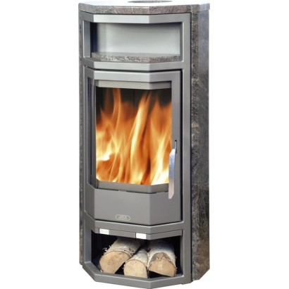 Топка этой печи изготовлена из стали, оснащена стеклокерамическим стеклом, выдерживающим температуру нагрева в 700 градусов С. Предусмотрена система двойного дожига, функция медленного горения и система «чистое стекло». Под топкой печи расположена удобная ниша для хранения дров, а в верхней части камина расположена ниша для разогрева пищи.