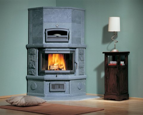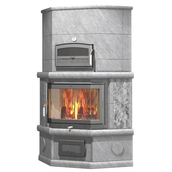 Угловая печь-камин с духовкой. 3 тепловой класс. Верхнее подключение дымохода.