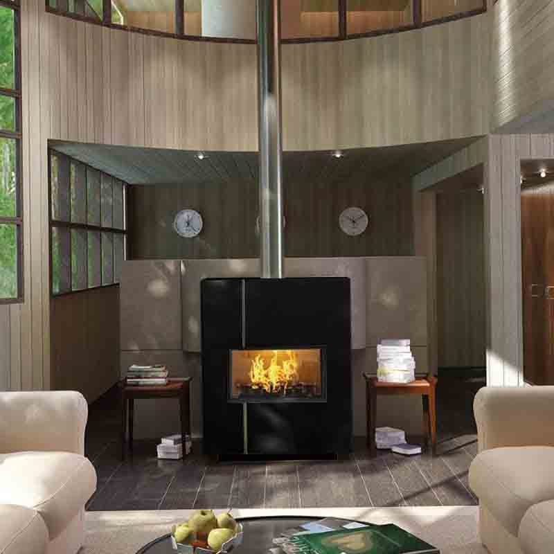 Металлическая отопительная печь-камин. Ввод наружнего/первичного воздуха. Облицовка для топки из нержавеющей стали. Вертикальная полоска-инкрустация из нержавеющей стали. Поднимающаяся и открывающаяся классическим способом дверца. Цвет RAL 9005.