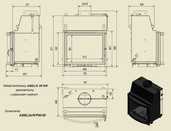 Топка с водяным контуром AMELIA/R/PW/30, панорамное стекло