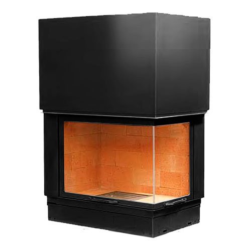 Топка двусторонняя угловая с правым боковым стеклом. Цвет черный. Стекло топки - цельное.