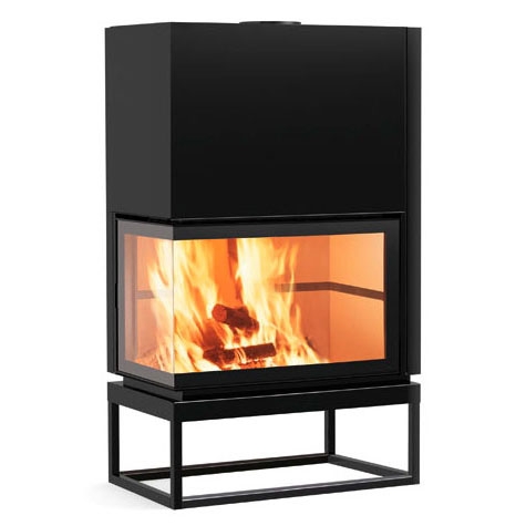 Угловая дровяная топка с очагом из огнеупорного материала и обширным обзором огня.
