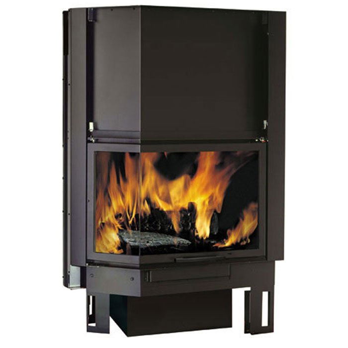 Закрытая топка со стальным корпусом и большим обзором огня. Боковое стекло (правое или левое) под углом 45°. Очаг с чугунной футеровкой. Плавный подъем дверцы - гильотина. Топка может устанавливаться как с фронтальной, так и с угловой облицовкой.