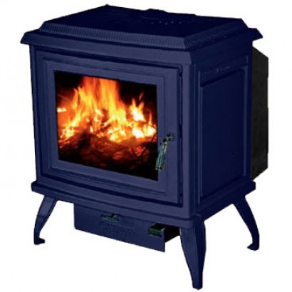Печь с фронтальной дверью, имеет систему Чистое стекло, ручка дверцы не нагревается в процессе топки. Печь покрыта эмалью, цвет - синий.