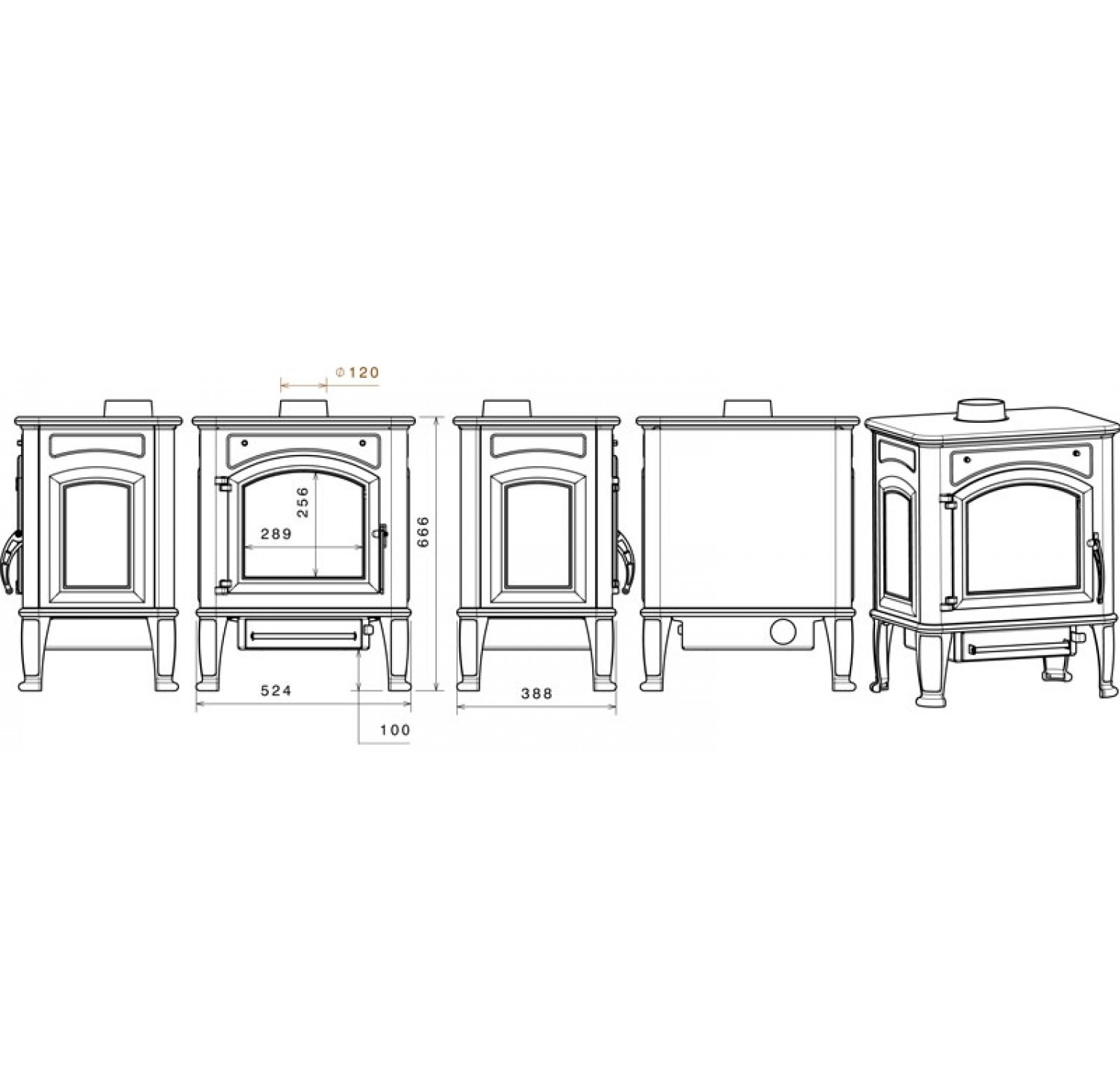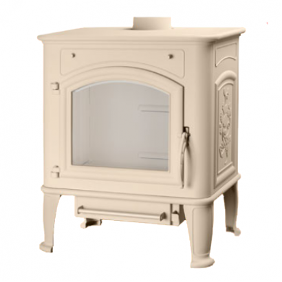 Чугунная печь бежевого цвета на ножках, с декоративным рисунком на боковых стенках.