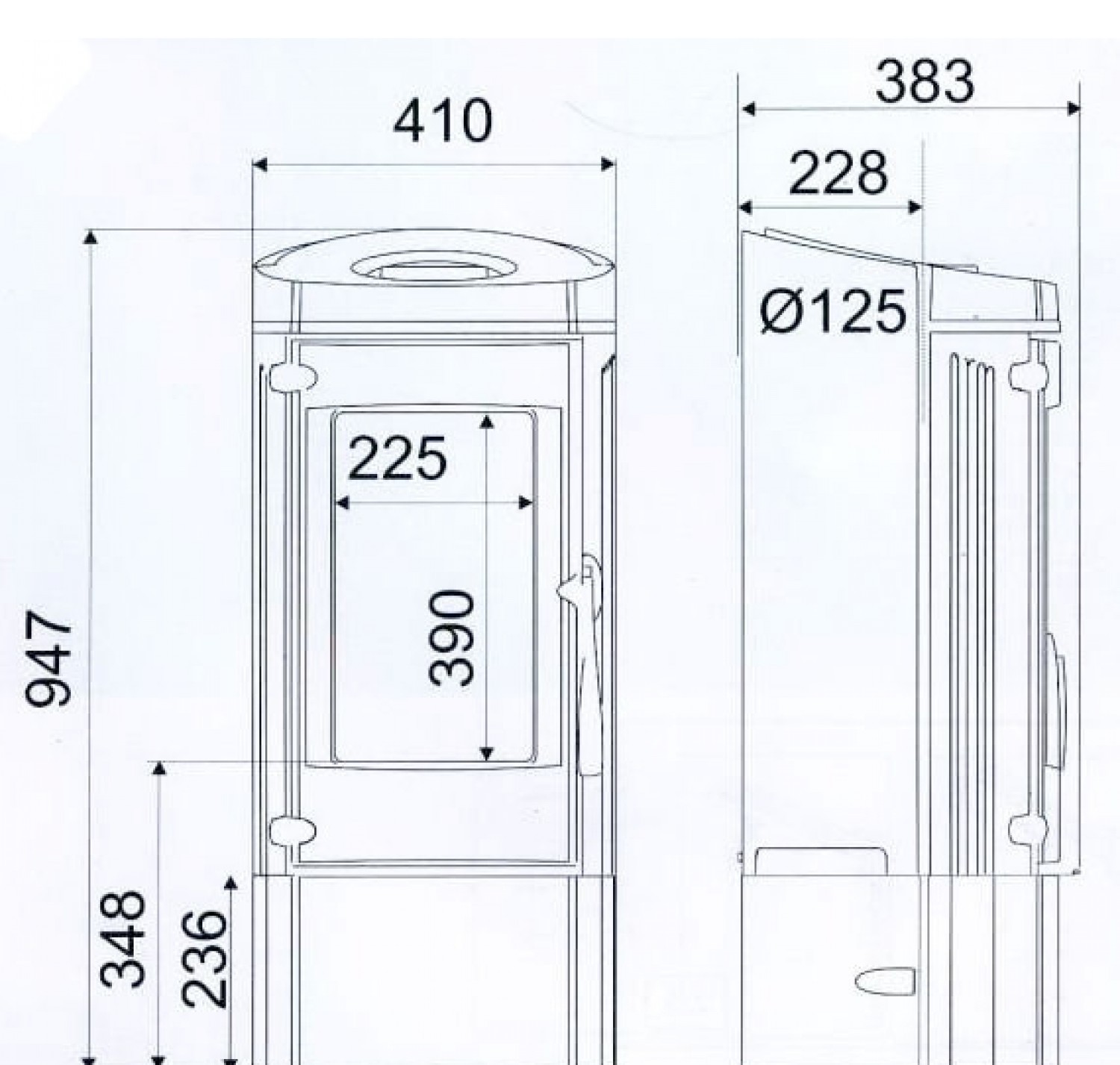 Печь дровяная черного цвета, изготовлена полностью из чугуна.
