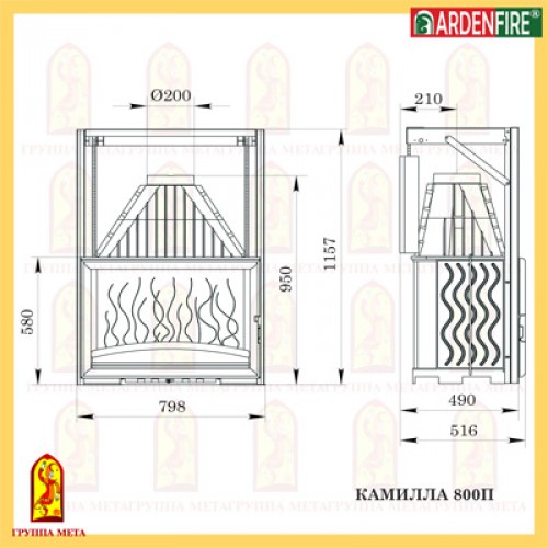 Каминная топка Камилла 800П выполнена из чугуна и оснажена подъемным механизмом двери. Предназначена для помещений объемом до 300 м3