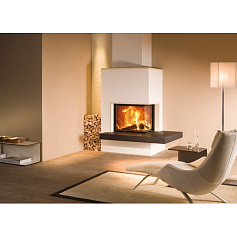 Угловая каминная топка с Г-образным стеклом. Топочная камера футерована шамотом. Ширина дверки 506+506 мм. Высота дверки 548 мм. Возможно подключение воздуха извне.