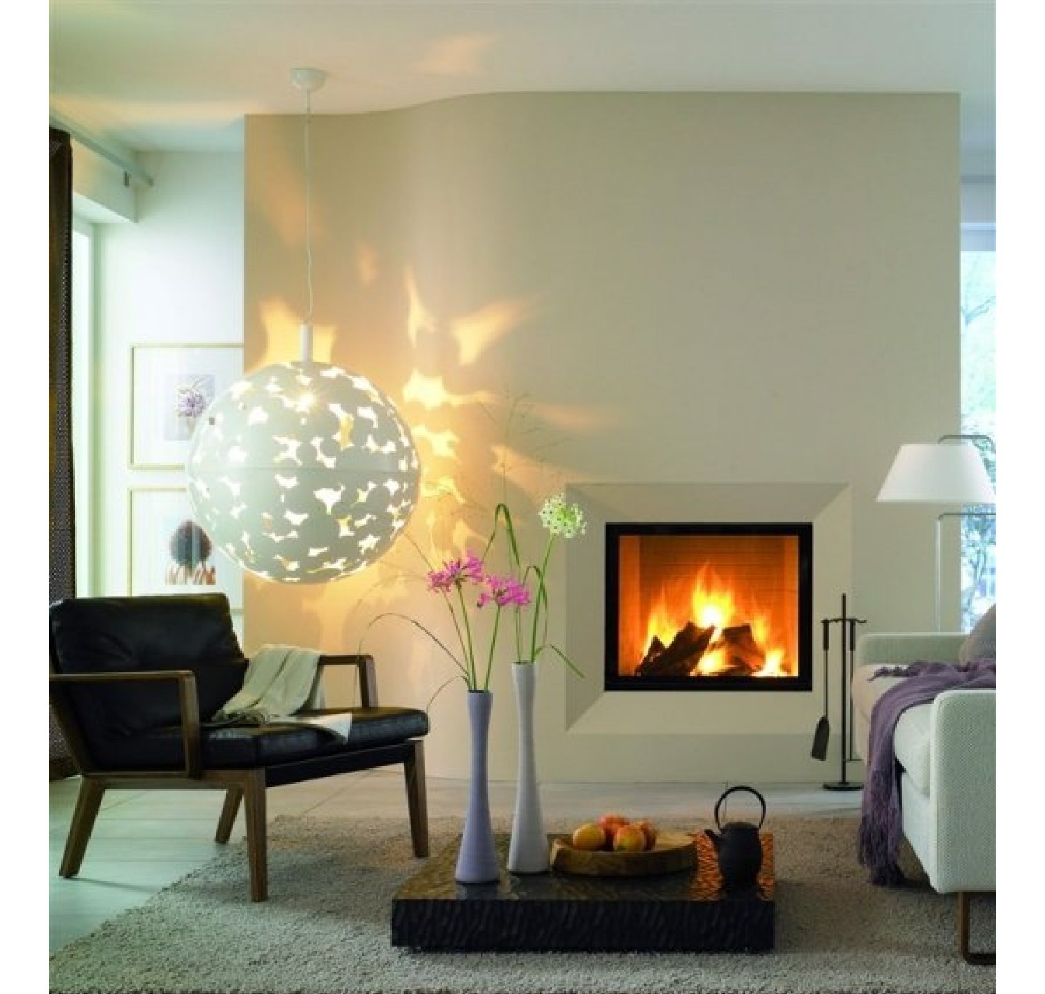 Каминная топка с прямым стеклом. Топочная камера футерована шамотом. Подъёмный механизм двери (система Easy-Lift). Ширина дверки 760 мм. Высота дверки 635 мм. Возможно подключение воздуха извне.