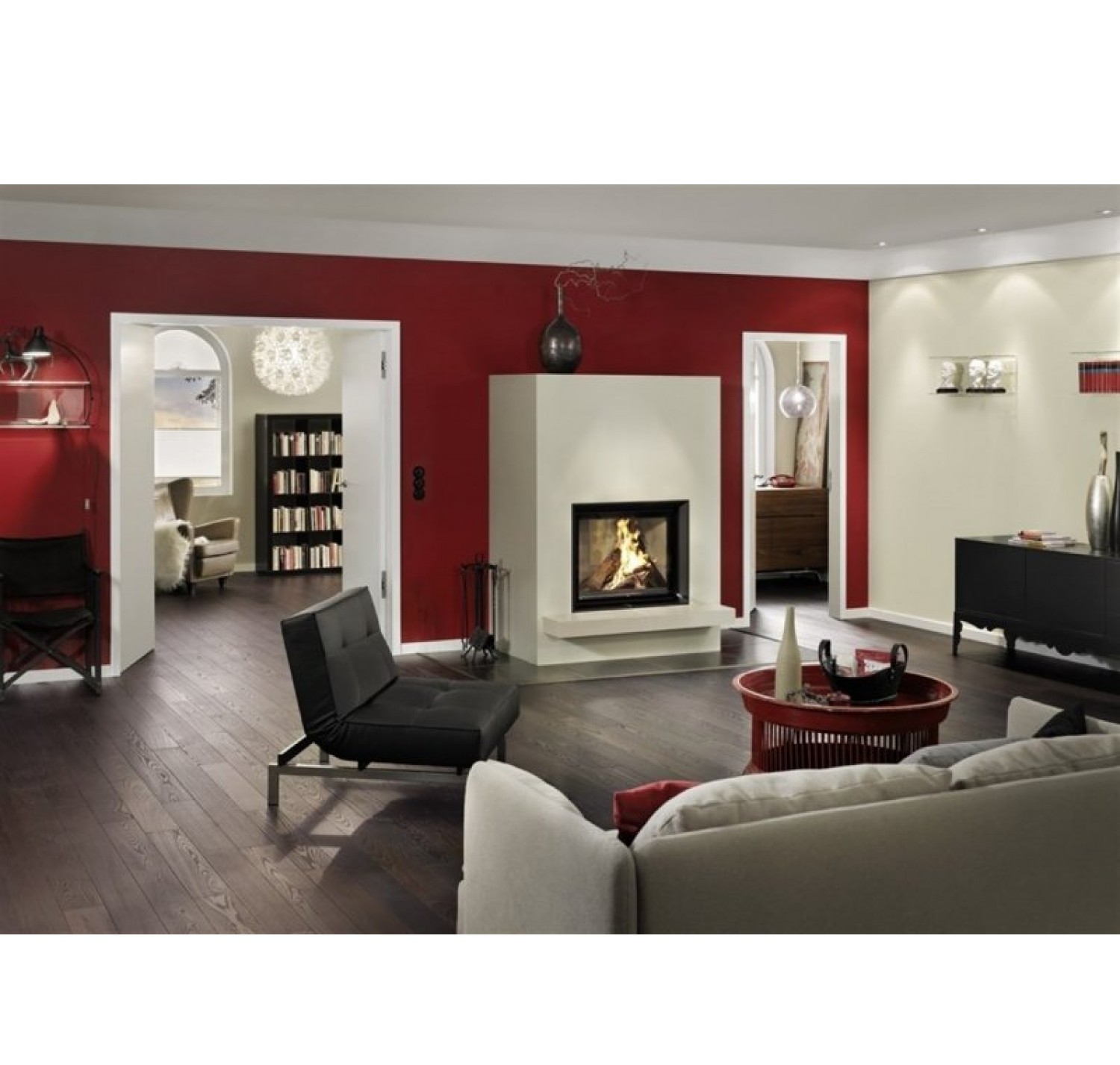 Каминная топка с прямым стеклом. Топочная камера футерована шамотом. Подъёмный механизм двери (система Easy-Lift). Ширина дверки 760 мм. Высота дверки 635 мм. Возможно подключение воздуха извне.
