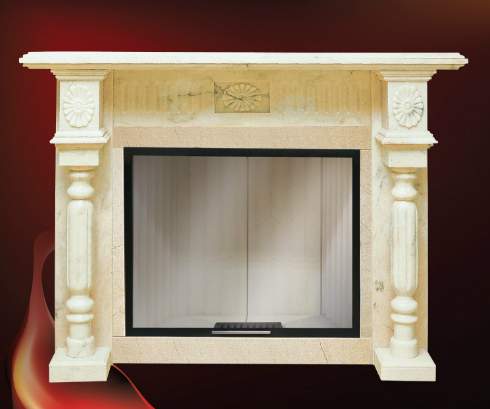 Декоративный камин оформлен круглыми резными колоннами, выполненными вручную, верх поратал так же украшен резными элементами.