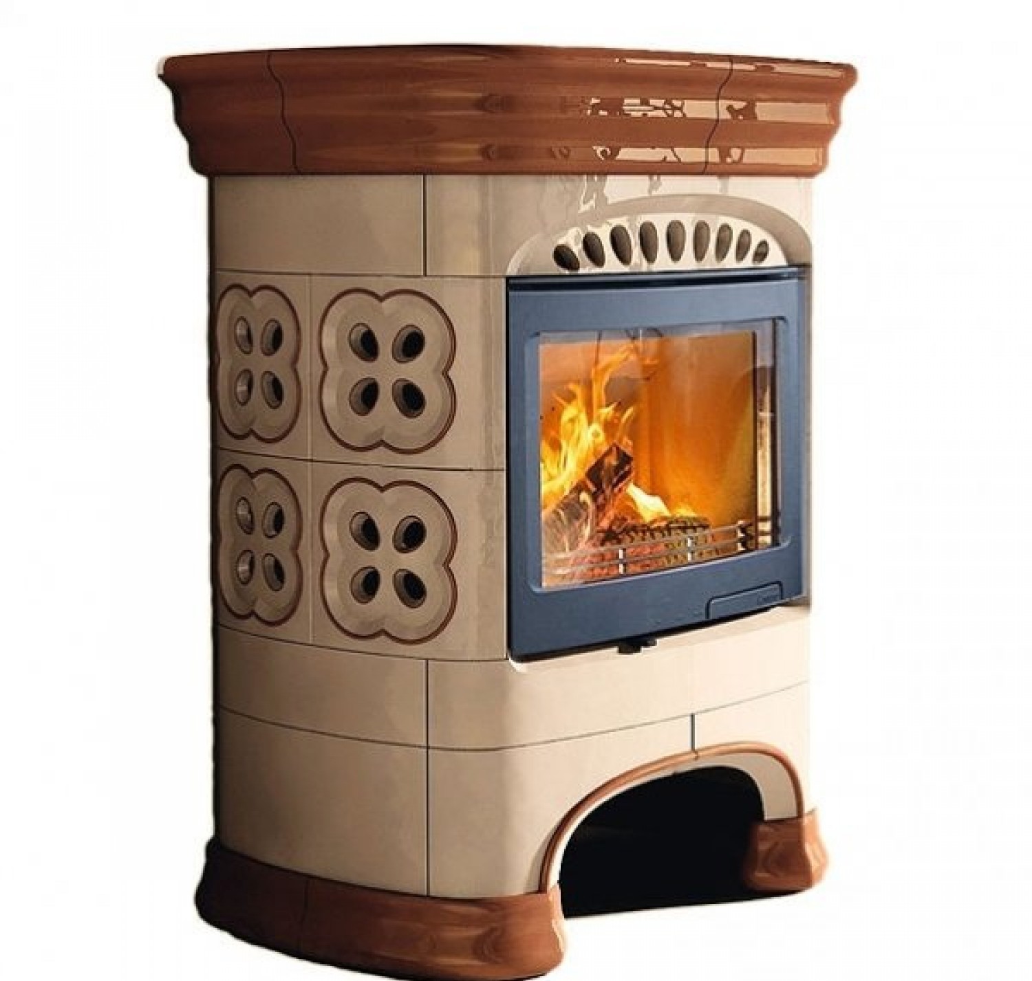 Варианты установки: пристенный (задняя стенка не облицована кафелем) и центральный (кафель по все окружности печи). Для подключения к дымоходам также дополнительно можно приобрести керамические трубы, которые изготовлены в едином решении с камином.