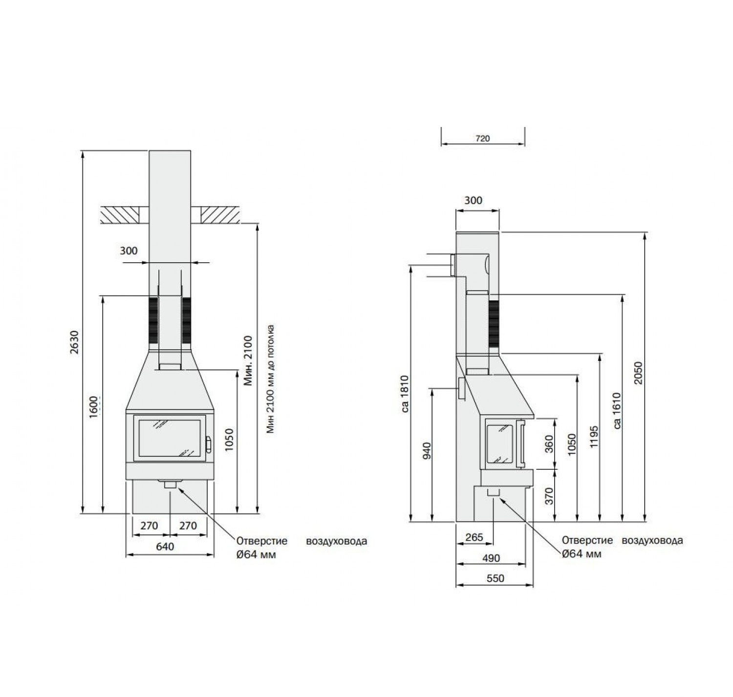 Печь-камин Сontura 450 T с панелями из керамики, вмонтированными в зонт камина.