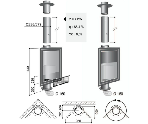 Этот камин представлен в двух версиях: Eurofocus 950 с открытой топкой (дверца застеклена на 3\4 высоты и Eurofocus 951 с закрытой топкой (дверца застеклена полностью и тонированное стекло). Обе модели каминов могут быть выполнены как с фиксированной топкой, так и с поворачивающейся топкой (центральный или островной камин) на 360 градусов (дополнительная напольная пластина заказывается отдельно). Камин может быть установлен как в пристенном варианте, так и в угловом.