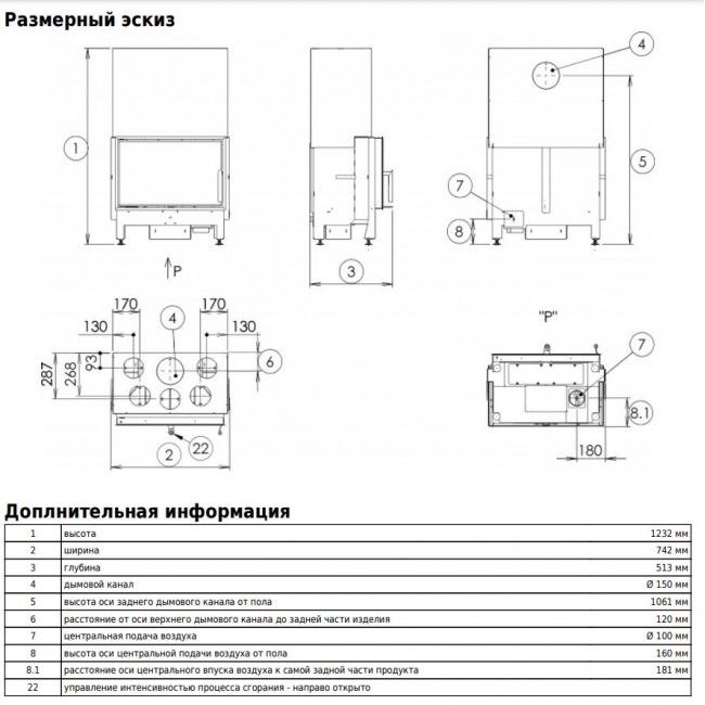 - Управление подачей воздуха на горение, осуществляется одним регулятором, расположенным под дверцей топки, а для подвода воздуха с улицы, предусмотрен специальный патрубок с выходом сзади или внизу топки.