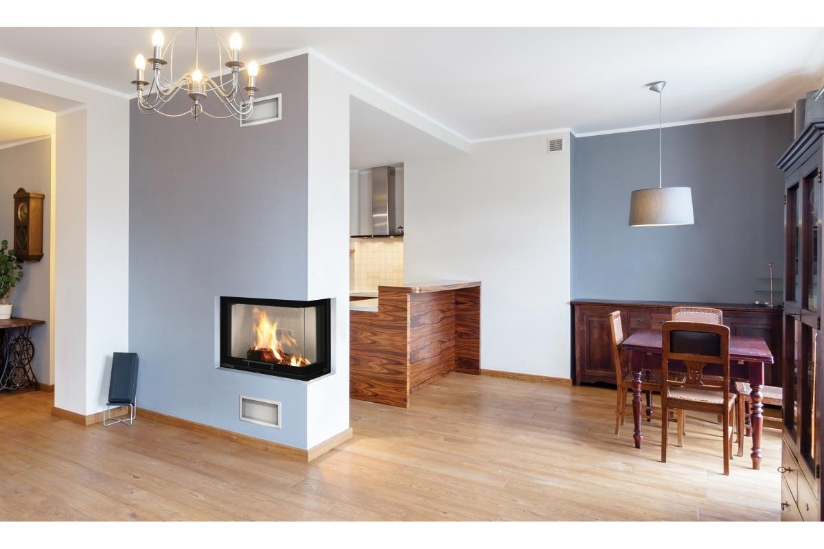 Угловая каминная топка BeF Therm V 8 CP с Г-образной формой дверцы и подъемом – это европейская современная модель предназначенная для работы на сухих дровах лиственных пород дерева или брикетах.