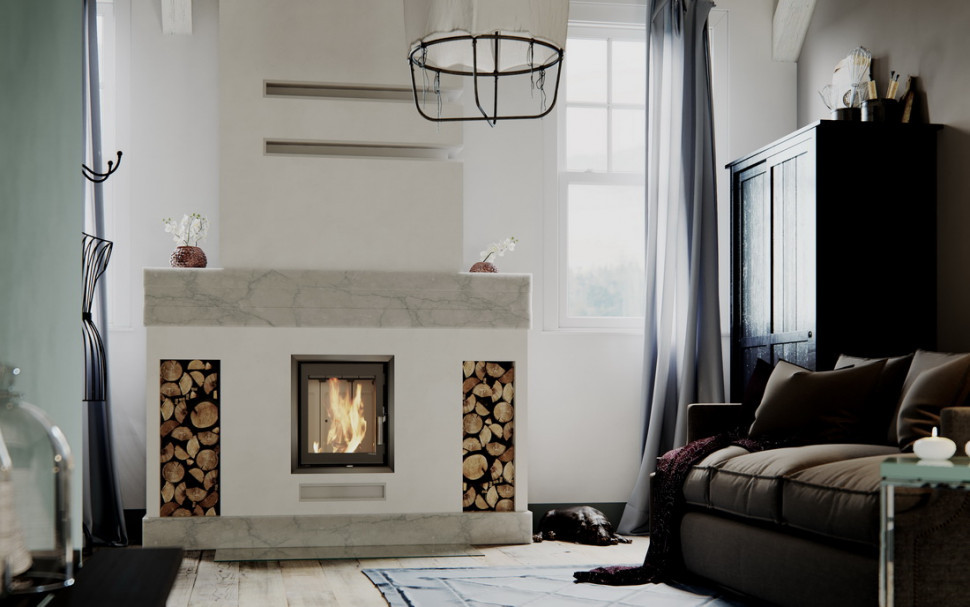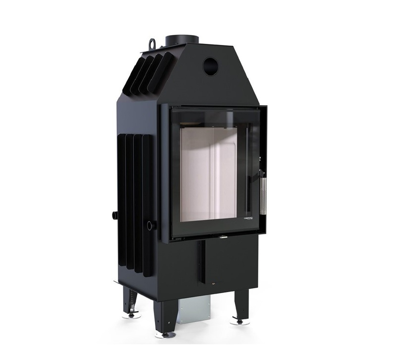 Изготовлена из стали с порошковым покрытием и имеет эффективность нагрева 80,9 %. Устройство с центральной подачей воздуха снаружи и возможностью ее регулировки. Специальная конструкция на трубе для подачи воздуха в топку, дает возможность изменить направление подачи воздуха на боковое. Плотно размещенные радиаторы способствуют передачи больше тепла окружающей среде, а воздуховоды повышают эффективность камина.