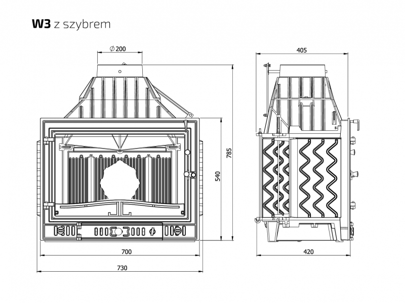 Каминная топка W3-16,7 кВт является классической топкой производимой заводом KAWMET многие годы, топка выполнена из толстого чугуна класса EN-GJL- 200 и оборудована подводом наружного воздуха в камеру сгорания, встроенным шибером для регулировки процесса горения и дымоотведения, более точной регулировкой подачи воздуха через нижнюю часть дверцы под колосниковую решетку, открыв ее на максимум, вы подаете к дровам оптимальное количество воздуха для быстрого розжига.