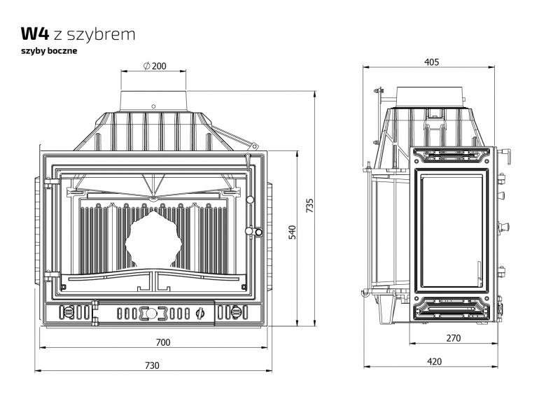 Классическая боковая каминная топка Kaw-Met W4 pb/lb 14,5 кВт с дополнительным стеклом для наслаждения игрой живого укрощенного огня с нескольких сторон, используется для отопления помещений как качественный дизайнерский отопительный прибор, а также как предмет интерьера. Жаростойкая плита в задней части топки декорирована гербом со львом.