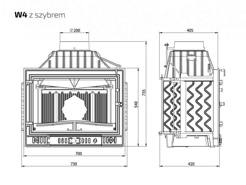 Каминная топка W4-14,5 кВт является классической топкой производимой заводом KAWMET многие годы, топка выполнена из толстого чугуна класса EN-GJL- 200 и оборудована подводом наружного воздуха в камеру сгорания, встроенным шибером для регулировки процесса горения и дымоотведения, более точной регулировкой подачи воздуха через нижнюю часть дверцы под колосниковую решетку, открыв ее на максимум, вы подаете к дровам оптимальное количество воздуха для быстрого розжига.