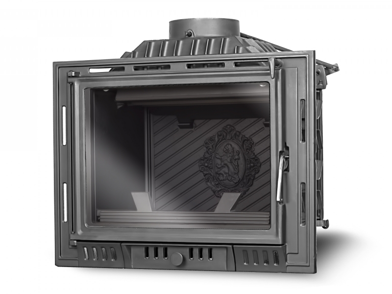 Повышенный КПД и теплоотдачу обеспечивает чугунный дефлектор, который расположен над камерой сгорания каминной топки KAWMET. Назначение дефлектора - направить недогоревшие частицы дровяного газа в центральную часть камеры сгорания, где происходит повторное догорание. Также дефлектор увеличивает тепловую эффективность топки путем удлинения пути прохождения продуктов сгорания.