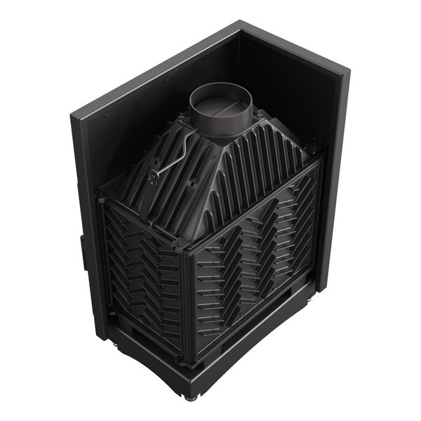 - Угловая топка с цельным Г-образным стеклом. Дверца топки распашная.