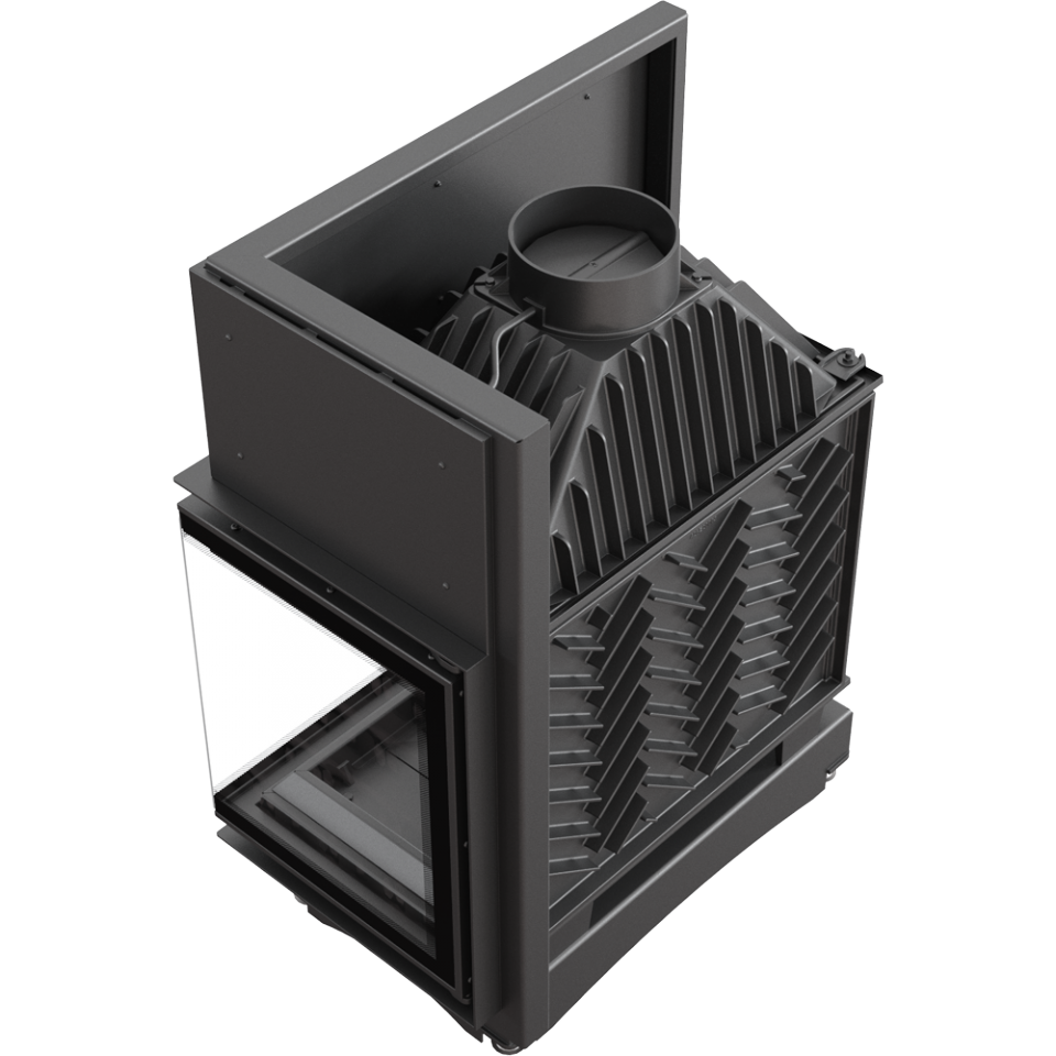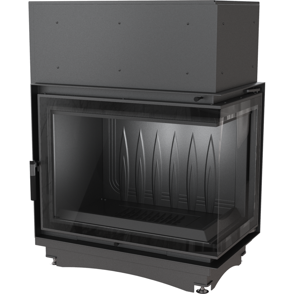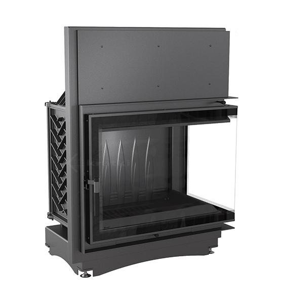 - Угловая топка с цельным Г-образным стеклом. Дверца топки распашная.