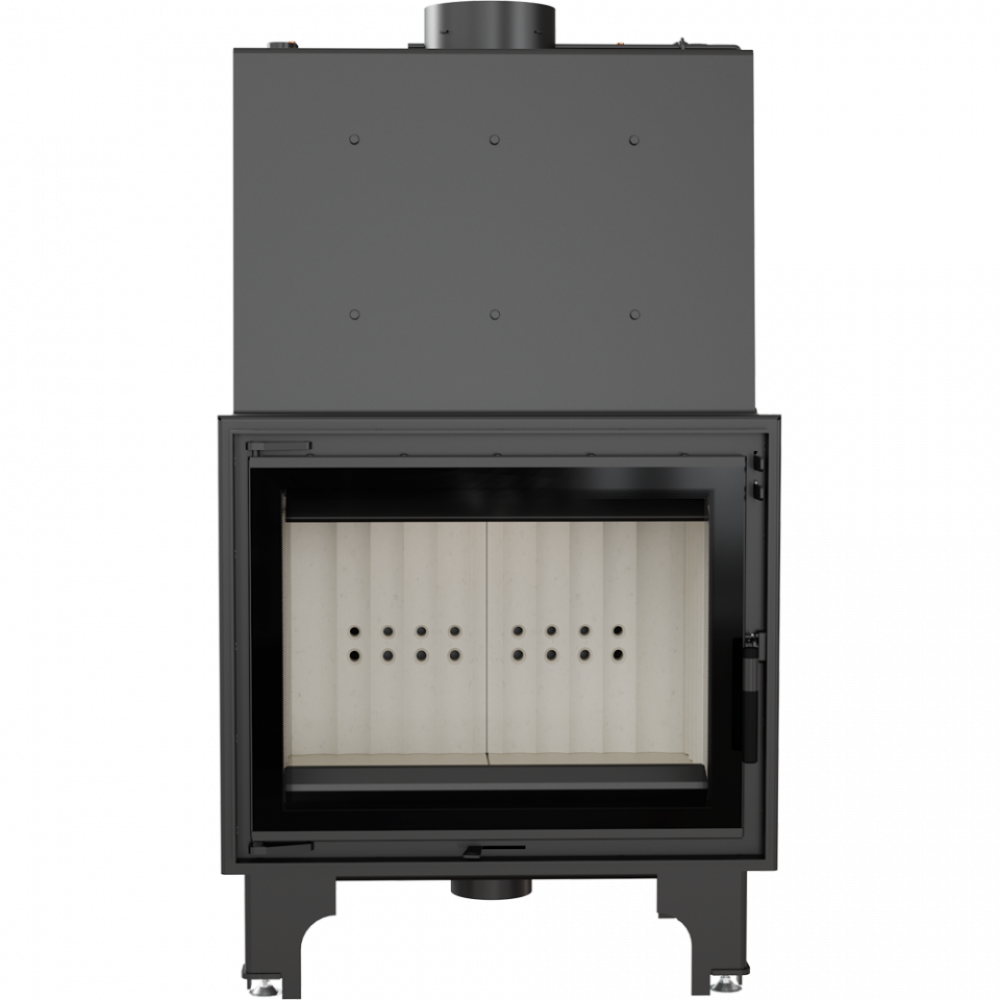- Система аэрации камеры сгорания, реализована исключительно извне через доставку первичного и вторичного воздуха в камеру сгорания. Стандартно топка имеет подвод воздуха диаметром ø 125 мм, который дает возможность подать свежий воздух в камеру сгорания снаружи здания. Разделение воздуха проходит в пространстве ниже нижней плиты камеры сгорания. Воздух поступает каналом, который находится на высоте нижней плиты к забору, оборудованному вдоль всей длины системой отверстий. Это приводит к улучшениям условий сгорания шихты. Сгорание происходит равномерно по всей ширине камеры сгорания. Регулировка интенсивности сгорания в топке происходит с помощью механизма, который находится ниже дверец топки.