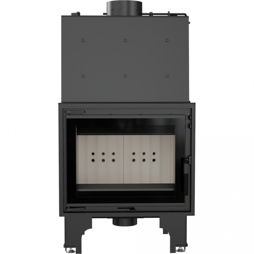 - Система аэрации камеры сгорания, реализована исключительно извне через доставку первичного и вторичного воздуха в камеру сгорания. Стандартно топка имеет подвод воздуха диаметром ø 125 мм, который дает возможность подать свежий воздух в камеру сгорания снаружи здания. Разделение воздуха проходит в пространстве ниже нижней плиты камеры сгорания. Воздух поступает каналом, который находится на высоте нижней плиты к забору, оборудованному вдоль всей длины системой отверстий. Это приводит к улучшениям условий сгорания шихты. Сгорание происходит равномерно по всей ширине камеры сгорания. Регулировка интенсивности сгорания в топке происходит с помощью механизма, который находится ниже дверец топки.