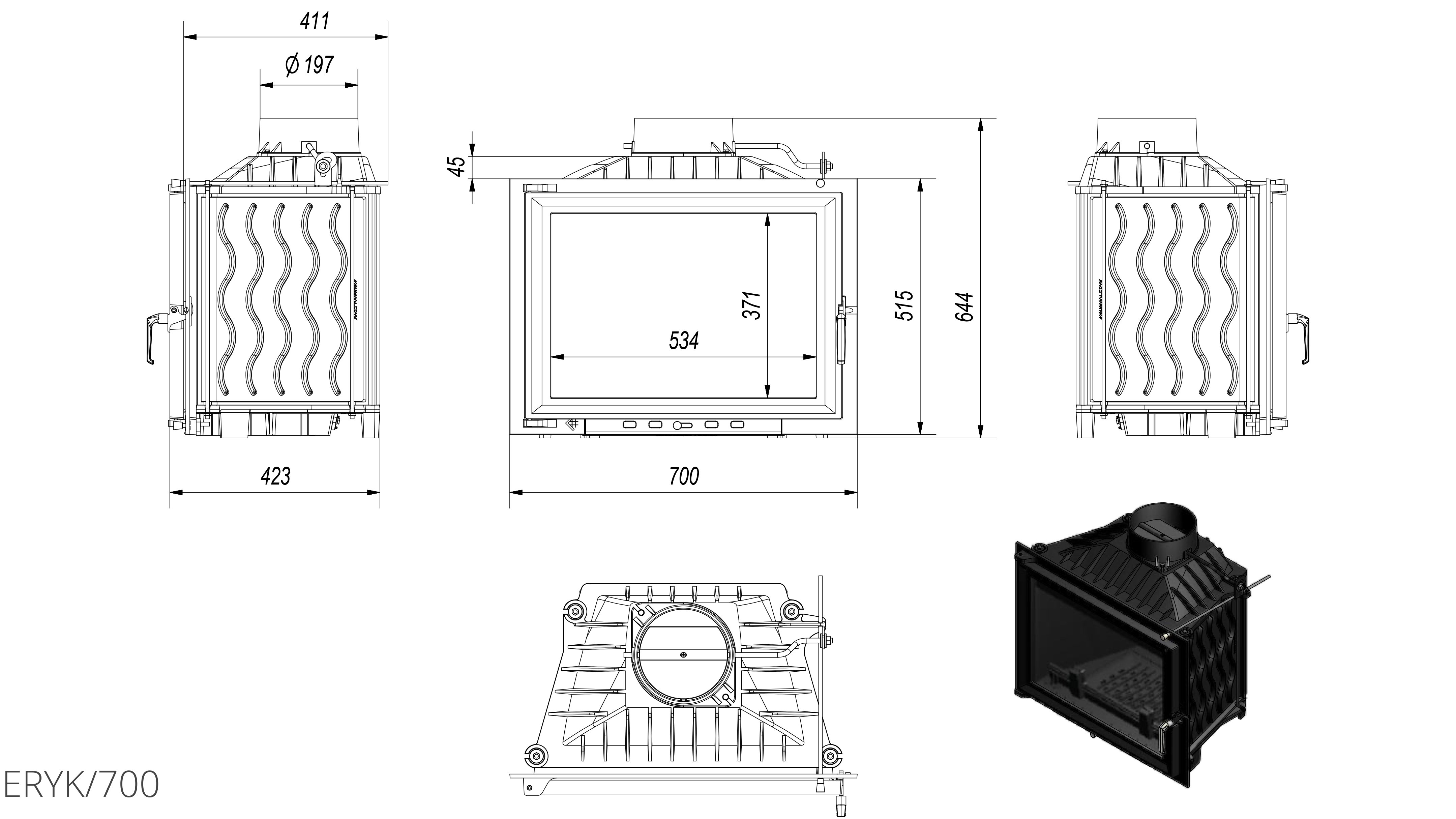 Топочная камера Eryk/700 – встраиваемая топка для дровяного камина от Kratki. Особенности данной модели – ширина рамки равная 700 мм. Топки, которые производит Кратки серии Eryk, выполнены из высококачественного чугуна и являются приборами с непрерывным процессом горения. Такие топки работают на твердом топливе – в основном это сухие дрова.