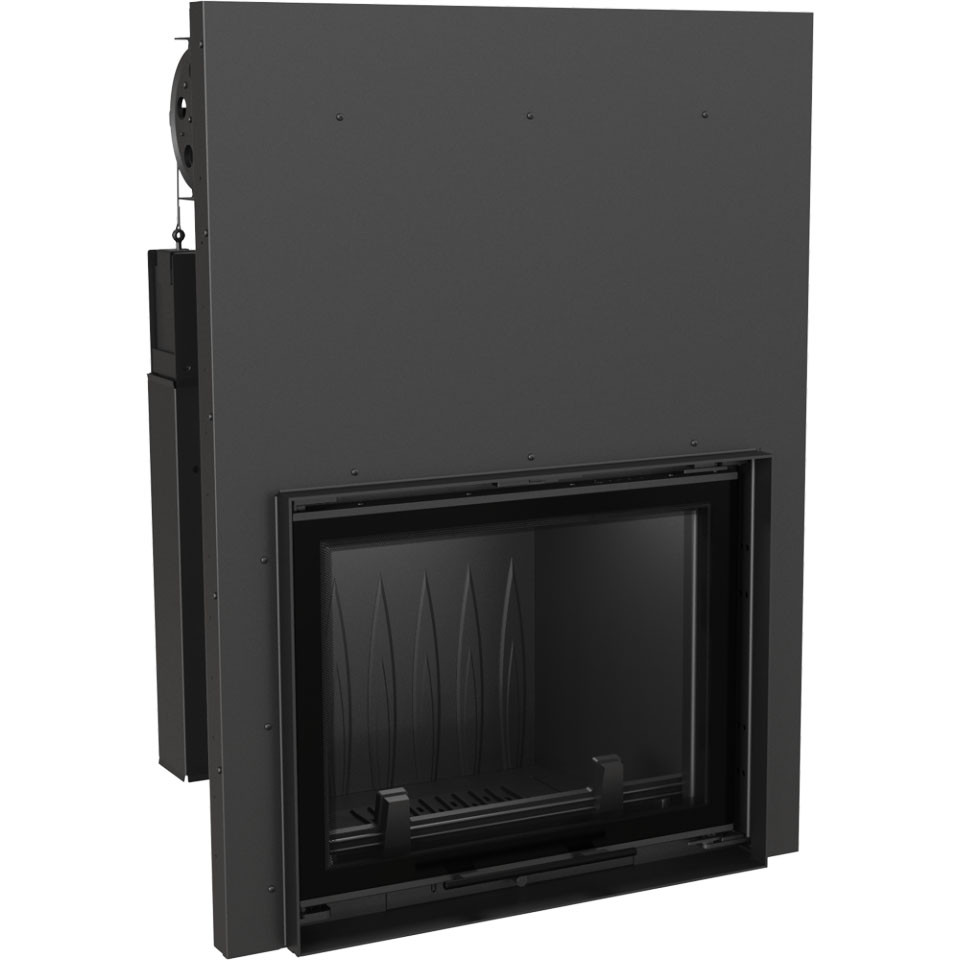 Чугунная каминная топка Kratki Felix/G (гильотина) с подъемной дверцей, декорированной стеклом, и трапециевидным основанием. Подъем двери легкий, практически без усилий. Угол открывания составляет 180°. Достигается это за счет противовеса, разгружающего вес двери. Модель имеет достаточно большую топочную камеру, в которую помещаются поленья длиной до 45 см. Дымосборник среднего размера, возвышается над топочной камерой. Его верхняя часть имеет плоскую форму.