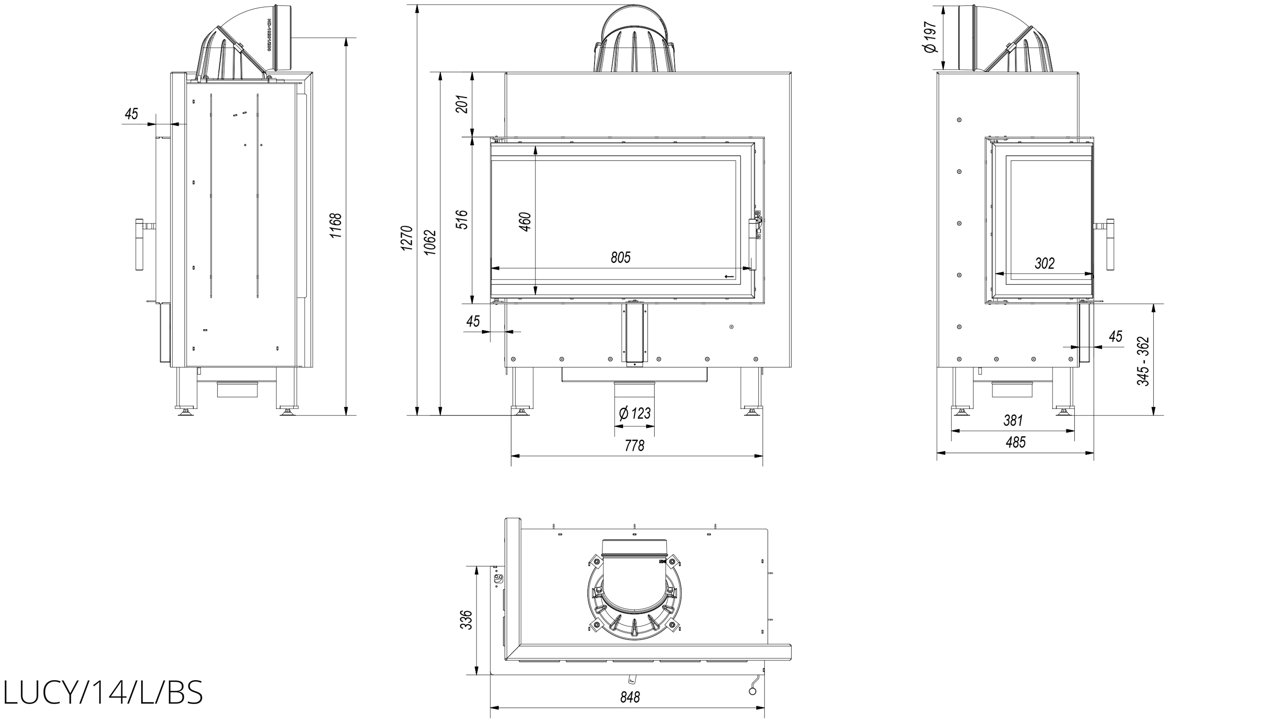 Каминная топка Kratki Lucy/14/L/BS (Г-образное стекло слева) интересной формы, с боковым стеклом. Благодаря двустороннему созерцанию огня и изящной передней рамке она отлично подходит под стилистику современных интерьеров.