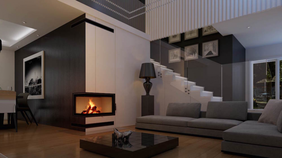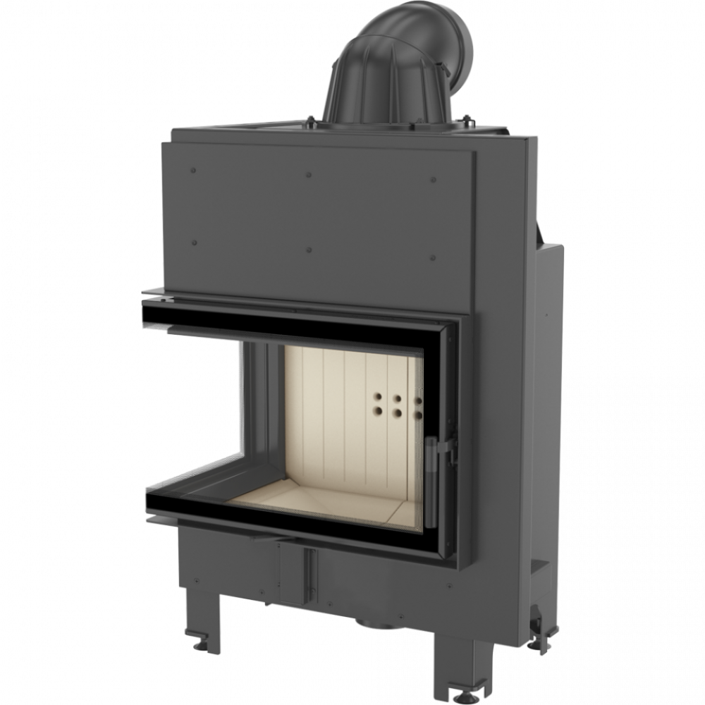 • Каминная топка с двумя стеклянными панелями, сопоставленными друг напротив друга под прямым углом (стеклянные панели соединены без рамы).