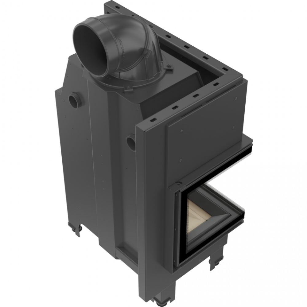 • Высокий переход из камина в дымоход и размещены поперек водяные дефлекторы увеличивают поверхность теплообмена между топкой и окружающей средой. Понижение температуры дымовых газов приводит к увеличению мощности устройства.