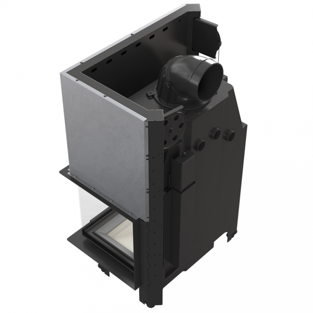 • Высокий переход из камина в дымоход и размещены поперек водяные дефлекторы увеличивают поверхность теплообмена между топкой и окружающей средой. Понижение температуры дымовых газов приводит к увеличению мощности устройства.