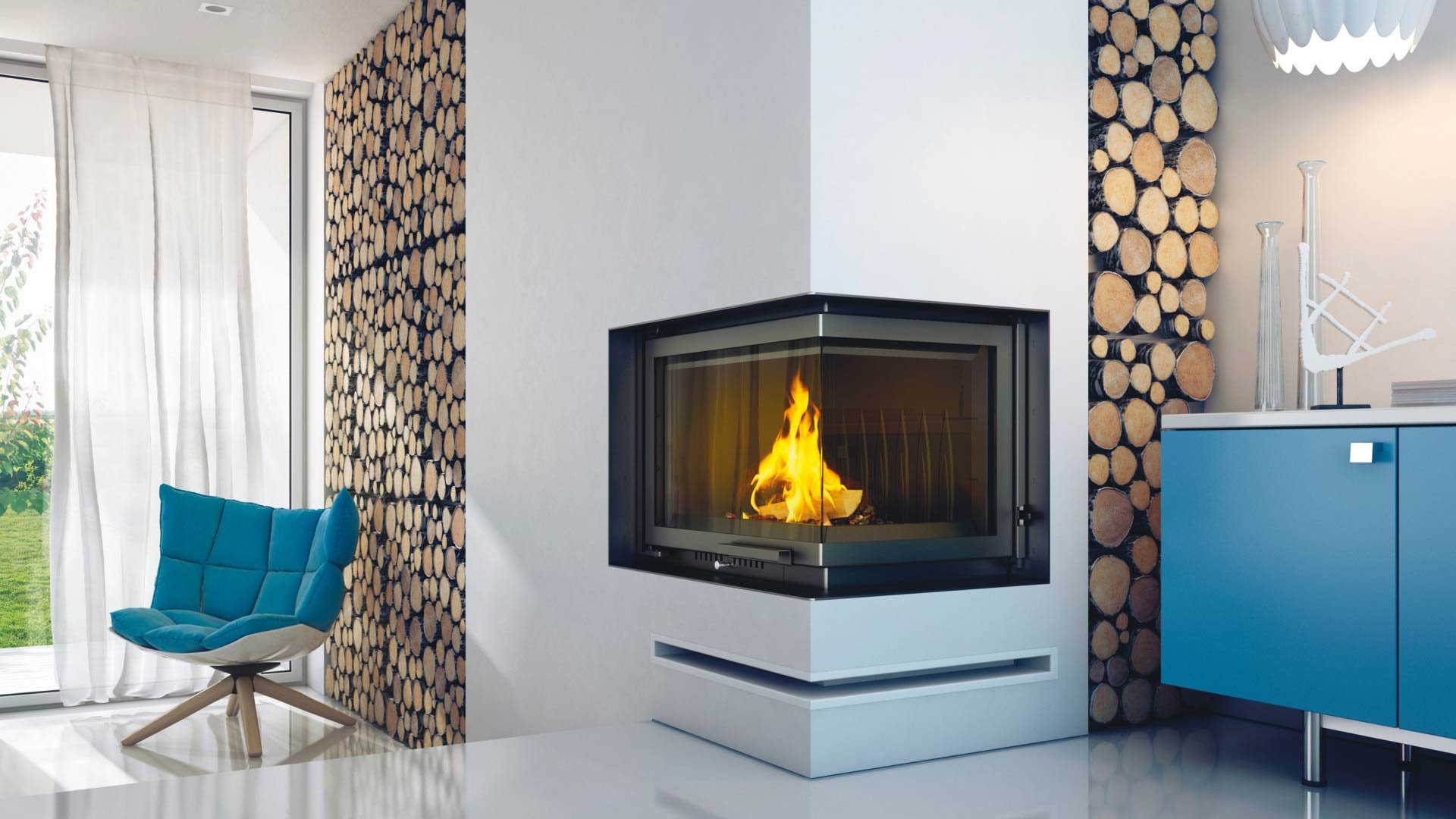 - Каминная топка с двумя стеклянными панелями, сопоставленными друг напротив друга под прямым углом (стеклянные панели соединены без рамы).